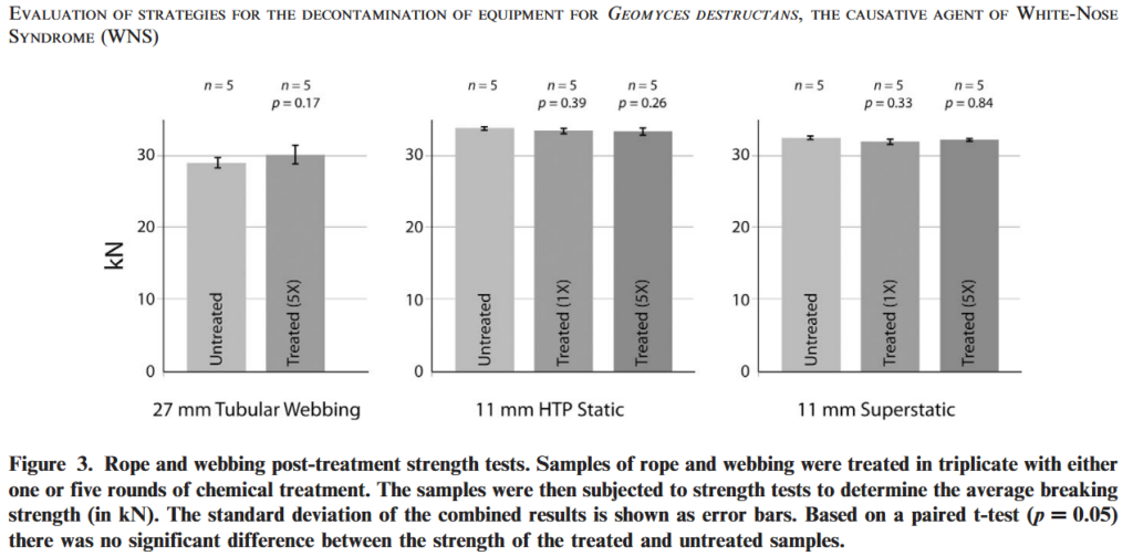Decontaminating safety gear has very limited information. Gear labels often limit cleaning to very mild methods insufficient for WNS decon. The following study is referenced in the 2024 WNS Decon Protocol which considered rope strength in it’s decontamination study.